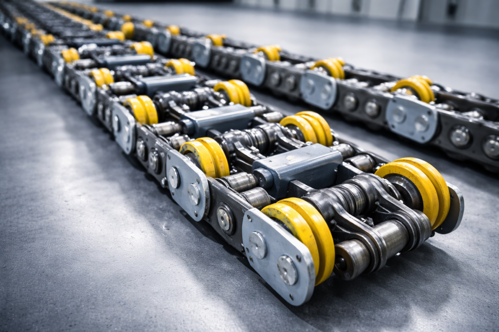 The step chain connects all the escalator steps and allows them to move in a synchronized loop. It is built using robust materials to withstand continuous load and movement. A well-maintained step chain ensures smooth operation, reduces vibration, and prevents sudden jerks. Regular inspection and lubrication help extend its lifespan and improve overall escalator performance.
